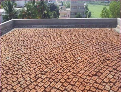 A traditional terrace waterproofing technique using brick pieces and mortar to ensure proper slope and water resistance.